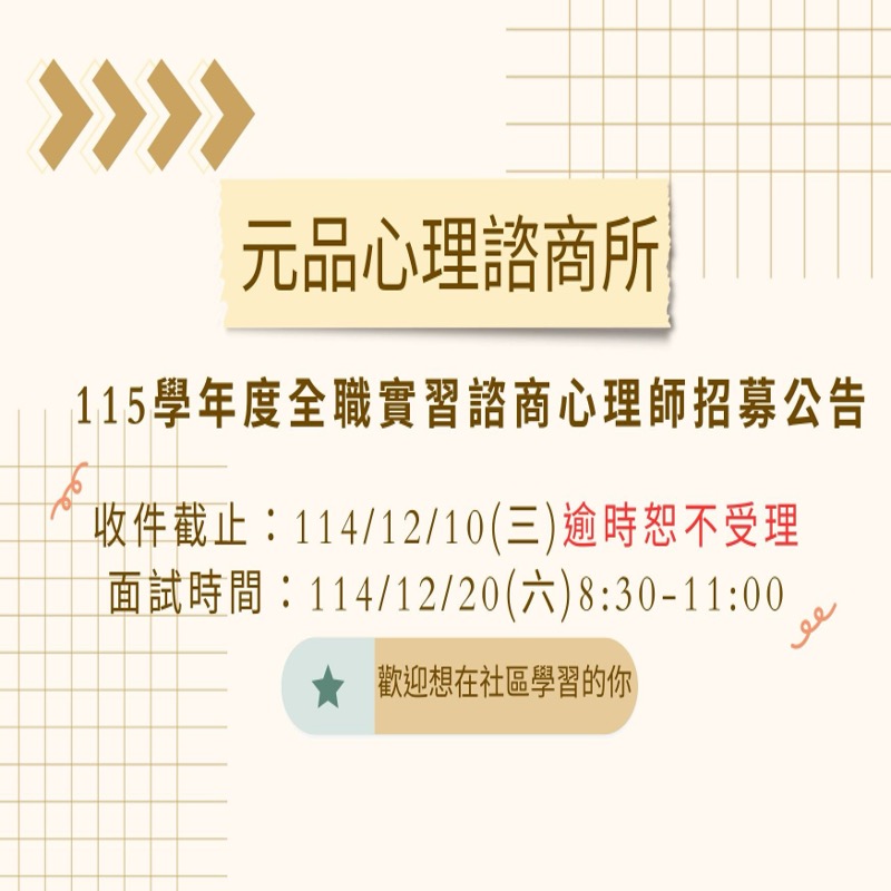 【招募】115學年度元品心理諮商所全職實習諮商心理師甄選