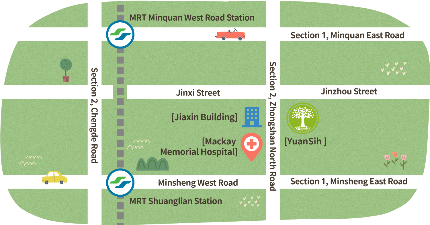 From Exit 2 (Mackay Memorial Hospital) of Shuanglian Station on the Tamsui-Xinyi Line (Red Line), turn left and walk straight along Minsheng West Road until you reach the intersection with Zhongshan North Road. Cross the street and turn left (odd-numbered side). Walk straight for about 3–5 minutes until you see I-Mei Foods. The counseling center is located on the 3rd floor of the same building.