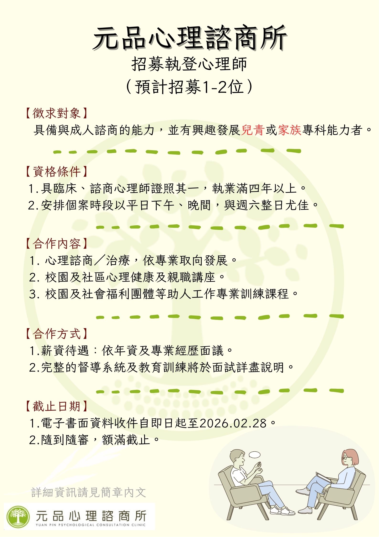 【招募】115學年度元品心理諮商所全職實習諮商心理師甄選