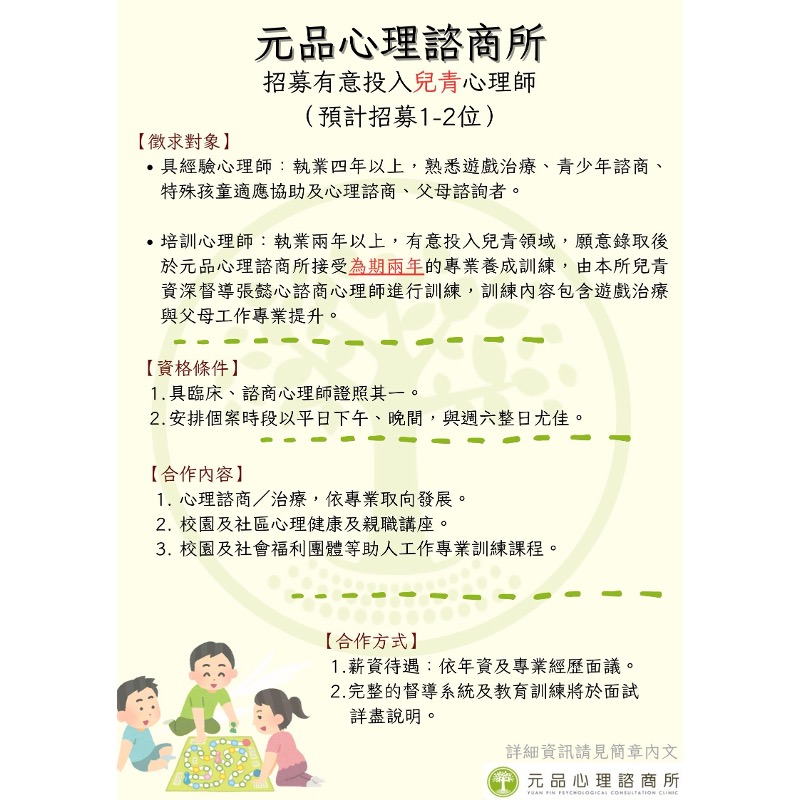 【心理師招募】114年元品心理諮商所招募有意投入兒青領域心理師